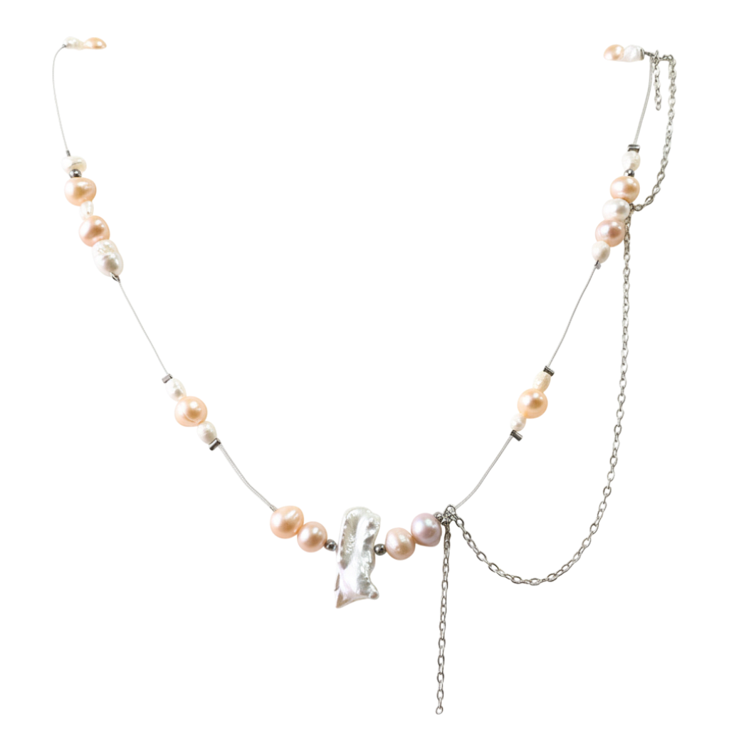 35cm plus 7cm extension necklace with freshwater pearls, crystals, gold hematite and stainless steel chain.