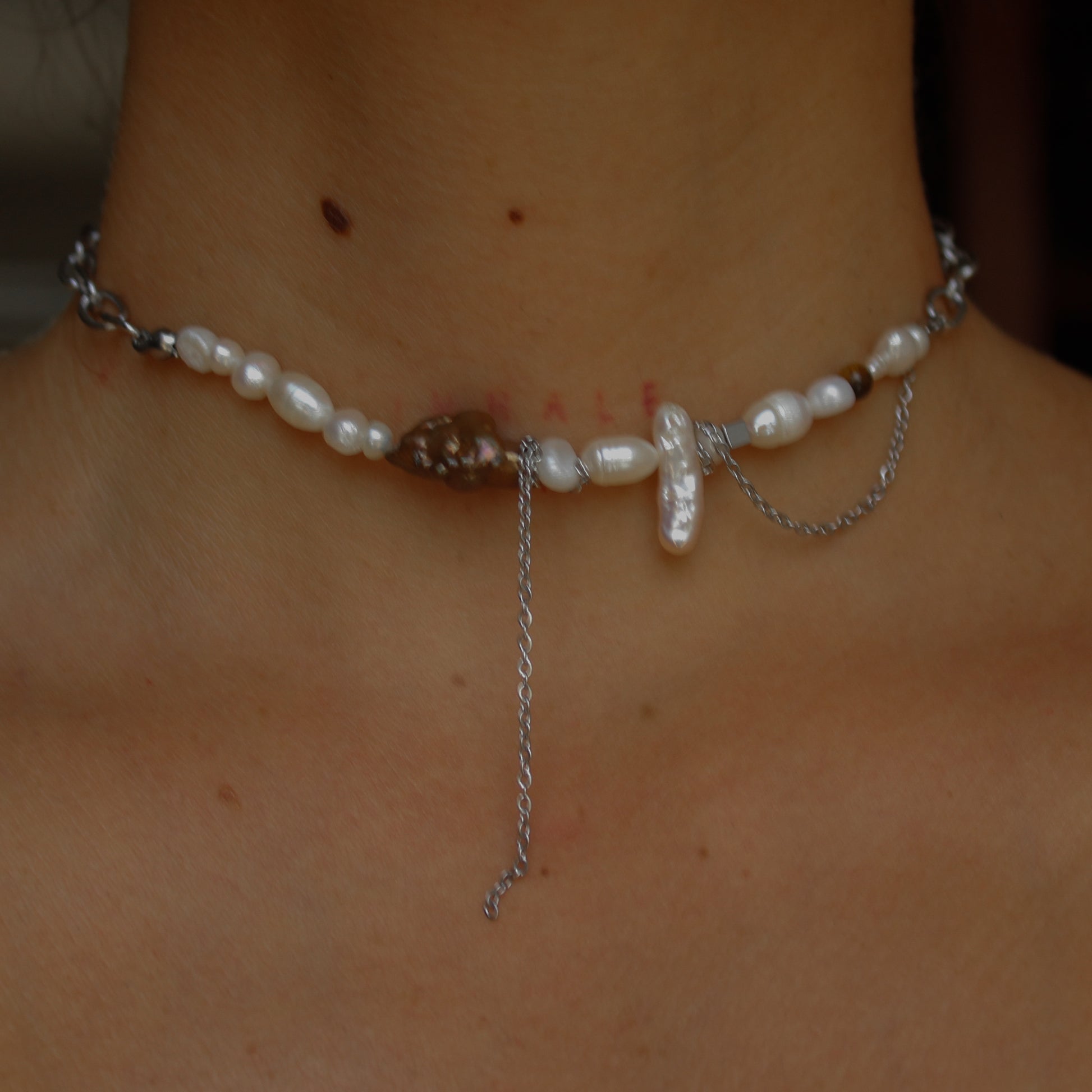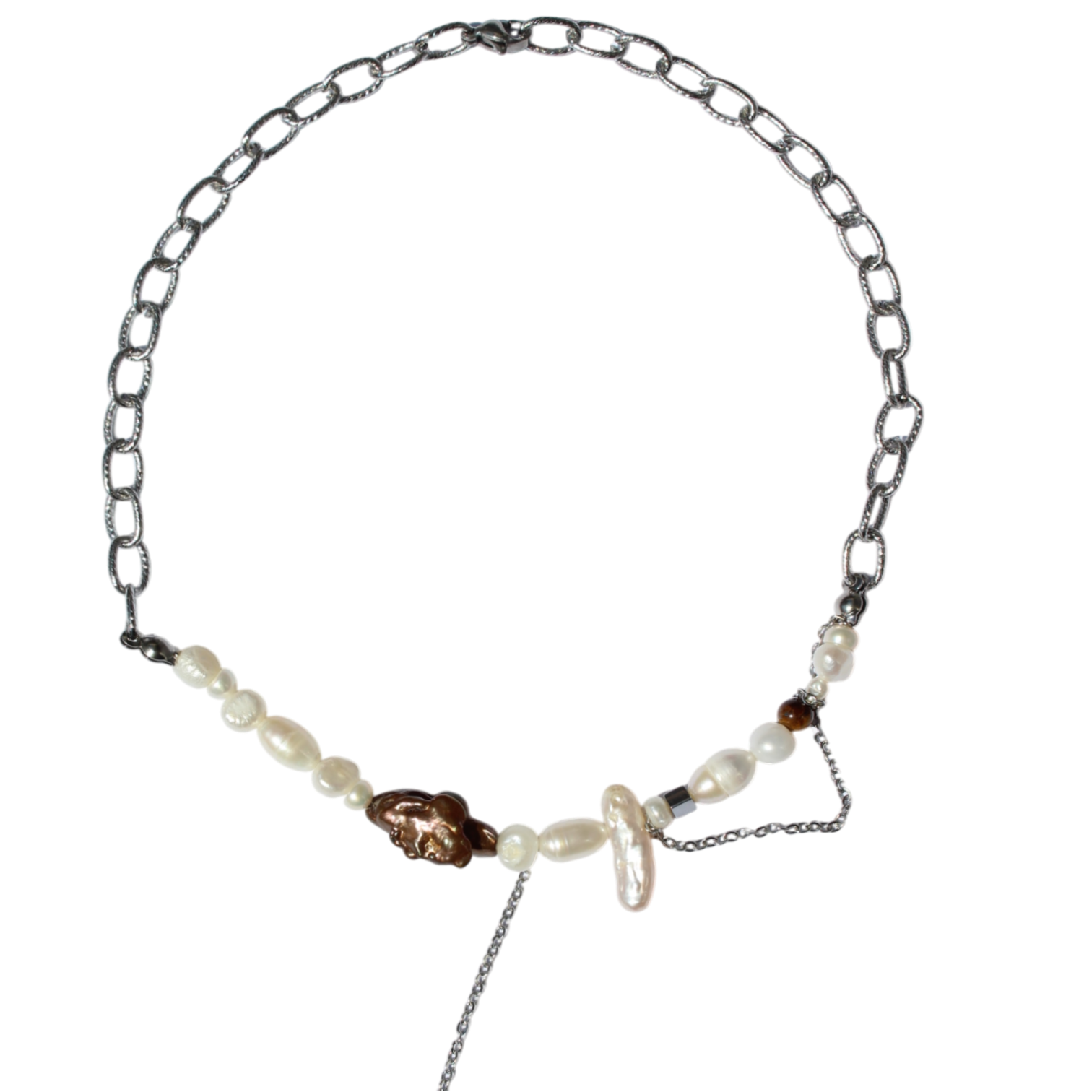 Stainless steel cable chain 9×5.5mm with freshwater pearls, baroque pearls, brown cross-shaped freshwater pearl, silver hematite and tiger’s eye stone.