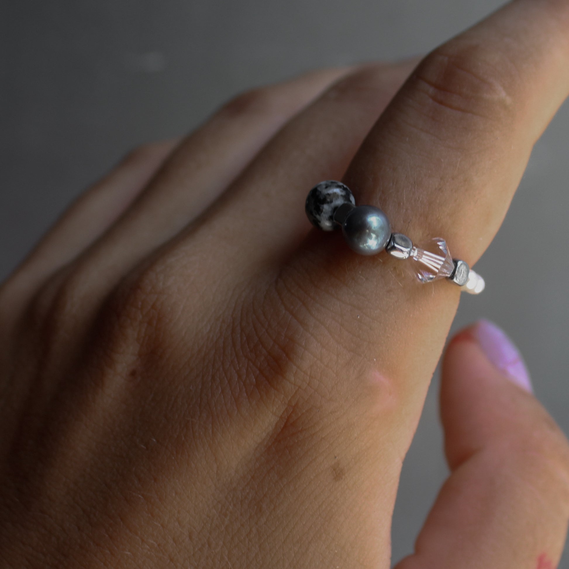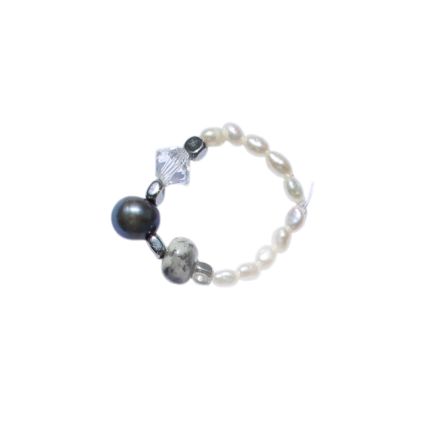 One size elastic ring with 2mm freshwater pearls, Swarovski crystal, jasper stone & silver hematite strung on monofilament.