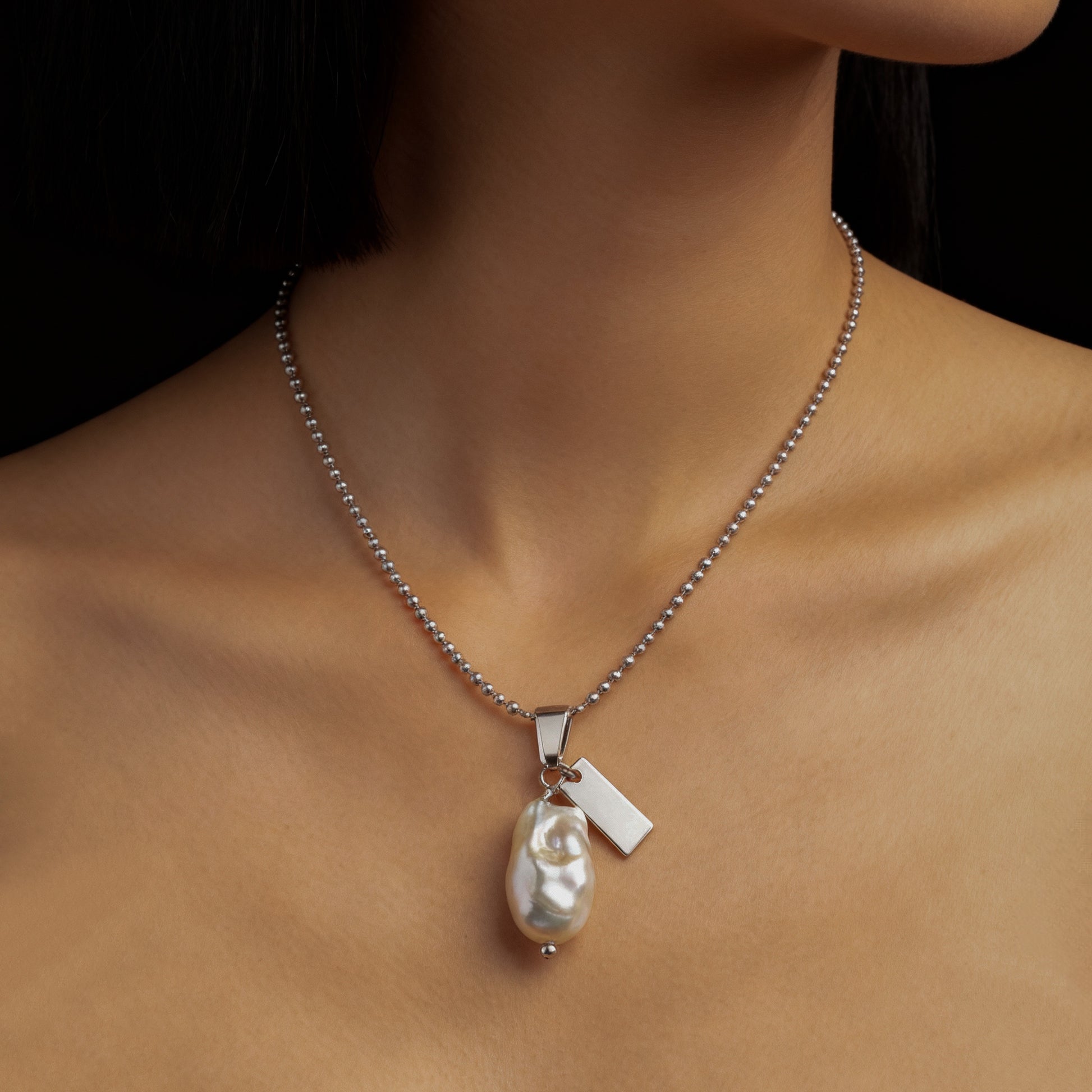 Stainless steel chain with a baroque pearl and MONÉ logo.