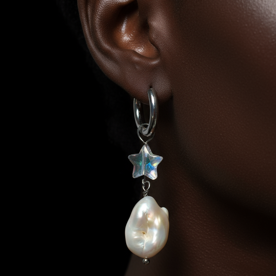 Stainless steel hoop earrings with baroque pearls and star shaped opal crystals.