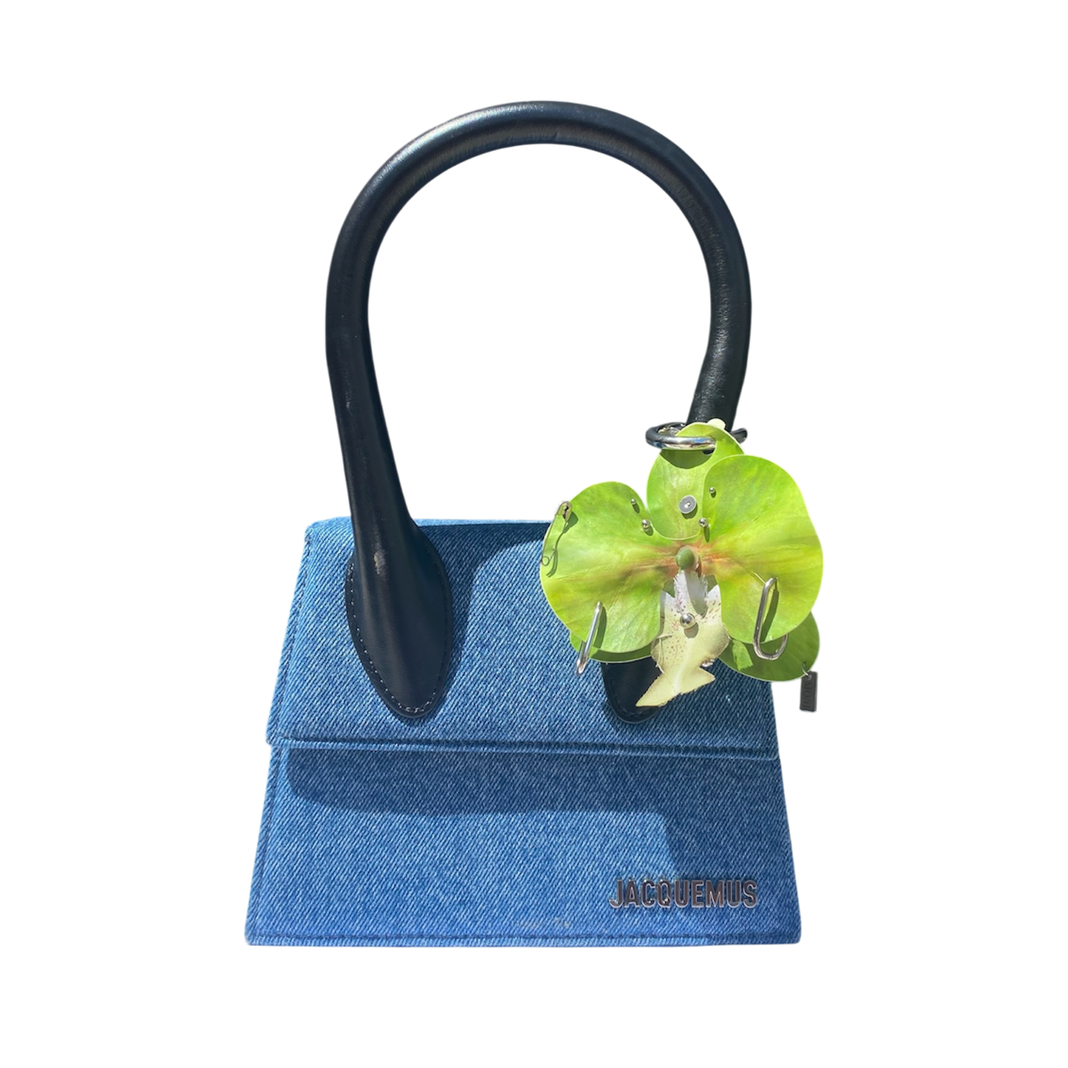 Artificial orchid charm with stainless steel piercings on a 35x5cm nickel keychain