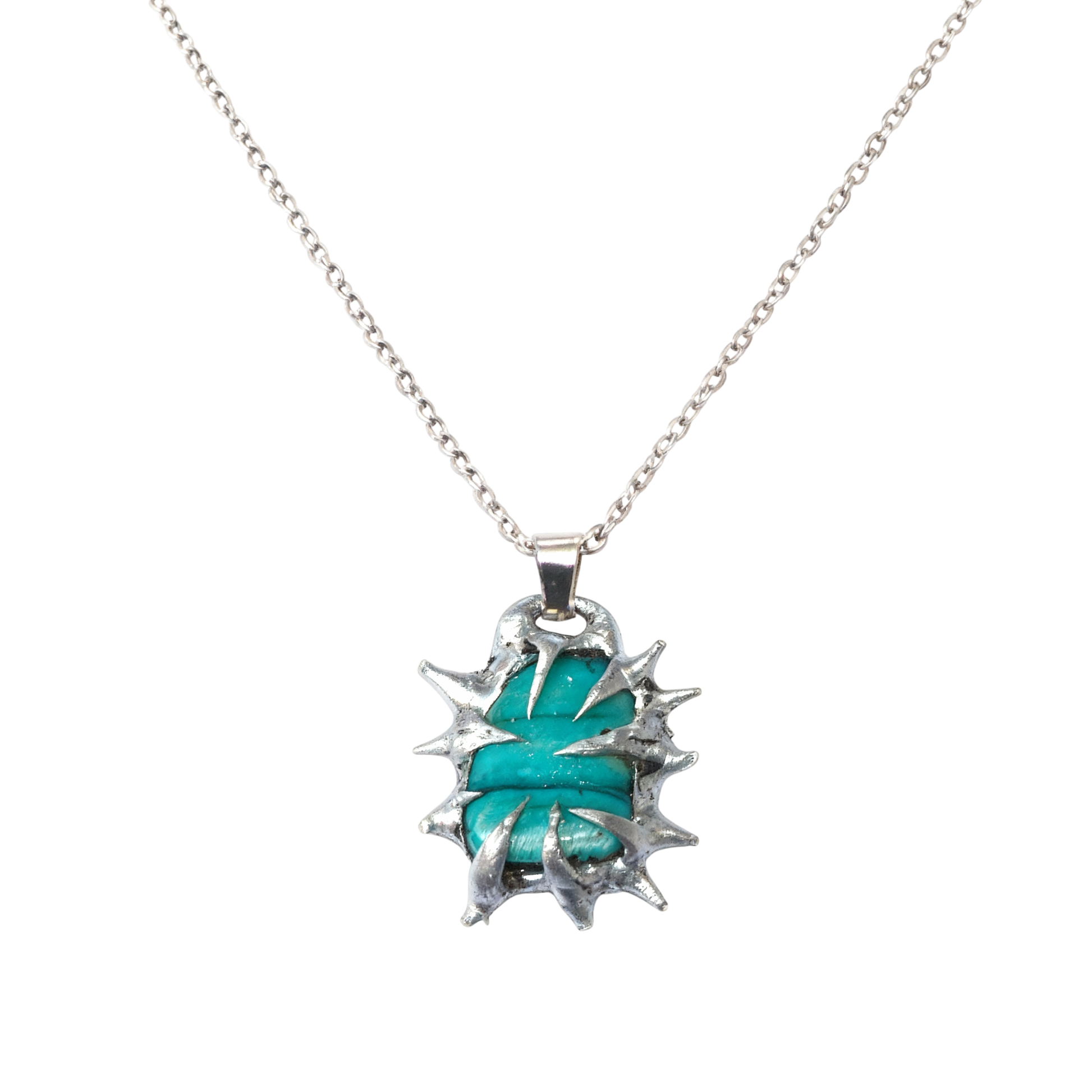 Spiky natural shell necklace in a stainless steel chain. Please note that each piece varies in colour, shape and size.